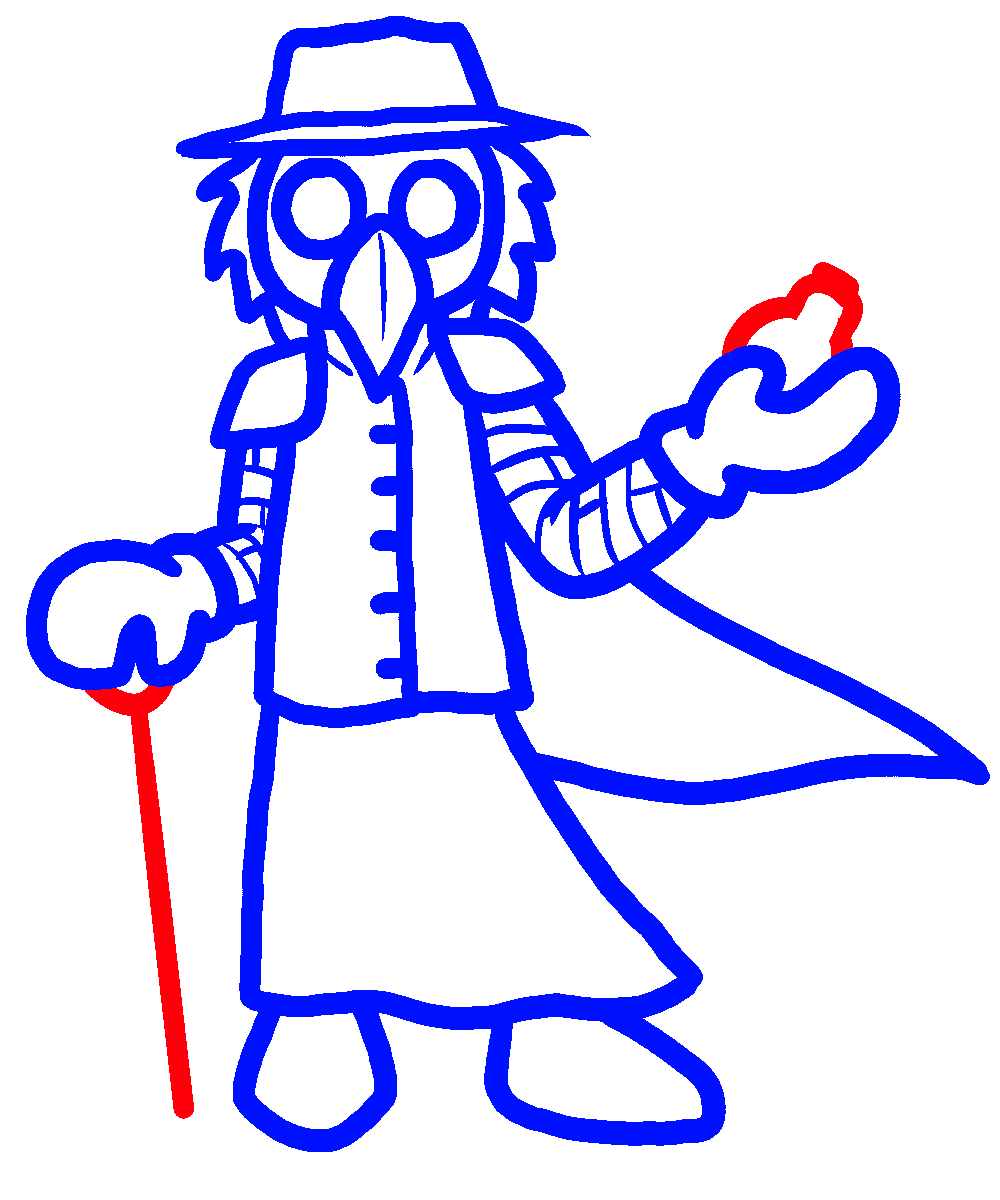 My notes, which I made in the previous post (where I didn't search for references) talks about the Doctor doing alchemy, so maybe he does status afflictions and debuffs. I can't have him buff the party, considering that I have another character (the Cursed) that in her main form mainly boosts the party, so he's going to fill in as the more aggressive status-giver. I also talk about him having a "weathered gunslinger hat," which isn't the right hat I'm looking for (apparently it's a fedora, m'reader), but hey, it's there. "Wears some old-timey clothes" is another note, which from my research, is mostly thick garb, from head to toe. I don't have it in the notes, but being a plague doctor, if he needed to, I think he should have a cane for close-combat. I also mention him drawn towards the dark arts, so maybe he's into some ritual stuff, which for an icon that symbolizes death, feels appropriate. I apparently also want him to have a cape, though I don't know how I would fit that into this design. We'll see, though.